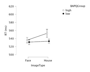 For this experiment, we examined response time (RT) in a 2 (Image Type: Face/House) x 2 (Congruence: Congruent/Incongruent) x 2 (SOA: Long/Short) x 2 (BAPQ Group: High/Low) mixed model using a repeated measures ANOVA, with BAPQ Group as the between-subjects variable. It was hypothesized that the independent variables of BAPQ group and Image Type would have a significant influence on RT. However, no reliable effect was observed in this area.