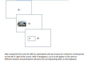 Following that, the computerized attention-capture task began. Participants were instructed by text on the screen to focus on a central point on the computer screen as images of faces or houses were flashed off to the left or right. When a ‘p’ or ‘b’ appeared on the screen, participants decided which letter they saw by selecting the corresponding letter on the keyboard.